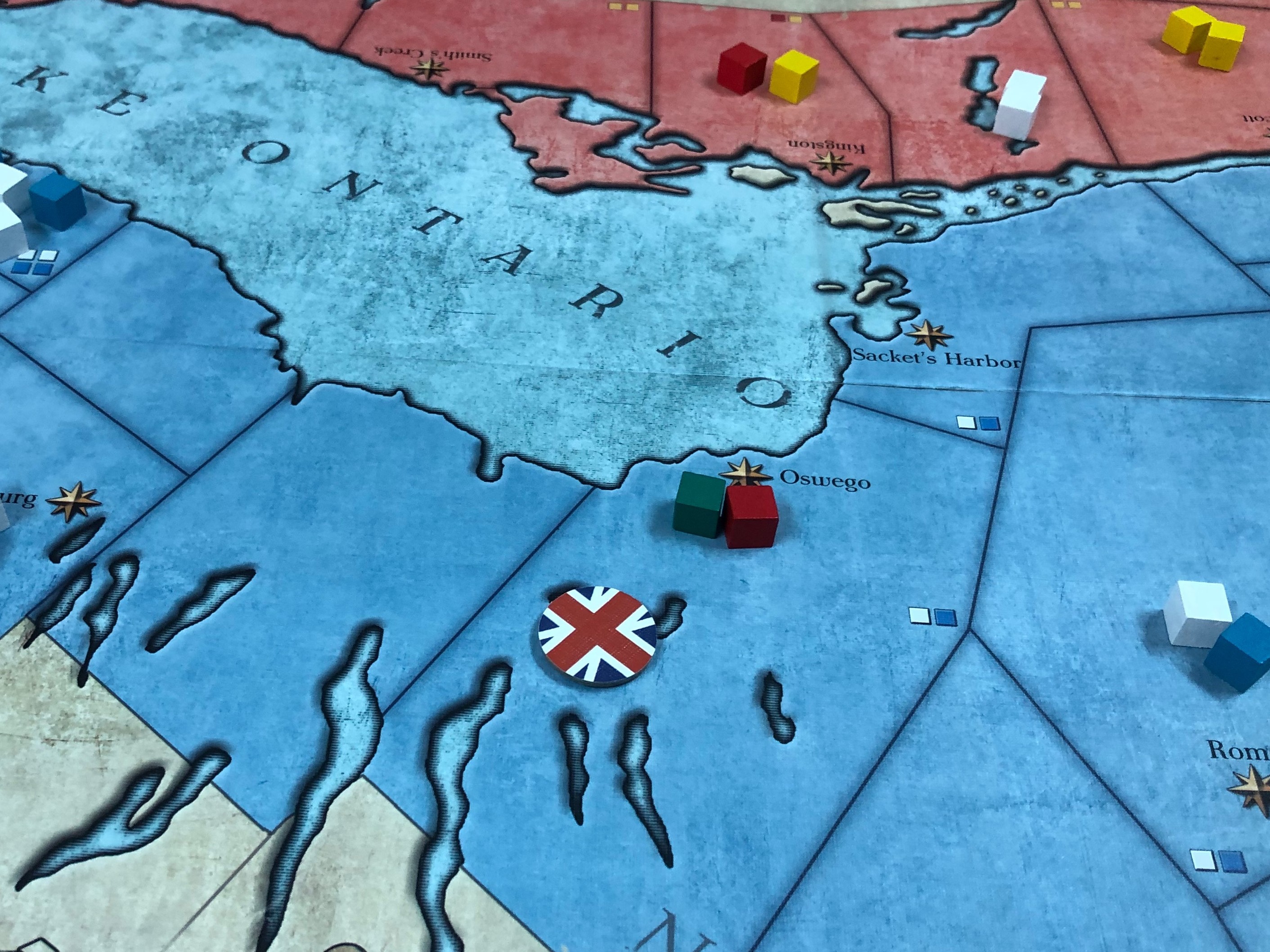 1812年某日,2隊分別位於奧斯威戈(Oswego)及薩基茨港 (Sacket’s Harbor)的美軍及民兵團在夜色的掩護下,利用小艇渡過安大略湖,登上英國支配的加拿大領土,正式對英國展開攻擊。隔日,察覺美國動向有異的英國,隨即派遣加拿大民兵驅趕登陸的美軍,並同樣派遣海軍越過安大略湖,在奧斯威戈建立英軍灘頭堡 。然而驅趕行動並未全面成功,但至少將美國正規軍全數擊敗,僅存的美國民兵戰力不如正規軍,且無後援,已不足為懼。