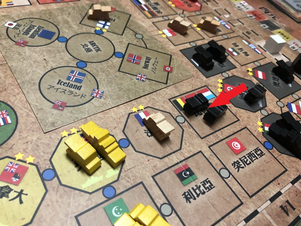 1943年,英國及蘇聯分別順利拉攏美國及中國加入同盟國,使得美中均參戰,致使同盟國形勢大好,是時正逢德國將被稱為「奇蹟武器」的V2長程火箭研發完成之際,為應對同盟國帶來的威脅,德國於是發射火箭破壞英國經濟及軍事建設(註:隨機移除手牌),導致英國國內發展停滯,德軍則趁勢擊破英國駐法國的單位並佔領之,直接威脅英國本土,所幸英吉利海峽的天然屏障阻擋了以陸軍編制為主的德軍,讓英國尚有喘息空間。此外,日本也彷彿在呼應戰友一般,展開大東亞作戰行動,以強大海軍擊退美艦,攻佔菲律賓,並伺機掌握太平洋諸島,使英美聯軍遭到軸心國的兩面夾擊。